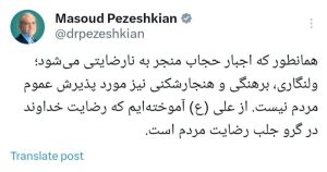 به گزارش اعتمادساز، «مسعود پزشکیان» امروز دوشنبه ۱۹ خرداد ۱۴۰۴ با انتشار پیامی در شبکه اجتماعی ایکس نوشت: همانطور که اجبار حجاب منجر به نارضایتی میشود؛ ولنگاری، برهنگی و هنجارشکنی نیز مورد پذیرش عموم مردم نیست.